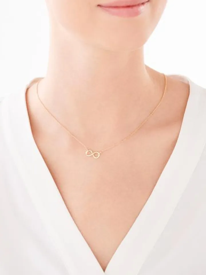 Piękny i delikatny srebrny naszyjnik z nieskończonością. Krótki naszyjnik z pozłacanego srebra próby 925 ma formę łańcuszka zwieńczonego charakterystycznym kształtem nieskończoności, która symbolizuje wieczność i to, co nie przemija. Naszyjnik na dekolcie prezentuje się subtelnie, a jego minimalistyczna estetyka sprawia, że jako dodatek będzie współgrał z wieloma stylizacjami. To idealny prezent dla kobiety, która ceni dyskretną biżuterię z wyjątkową symboliką. Naszyjnik można nosić z pasującą do kompletu bransoletką lub wieloma innymi wzorami, tworząc własne biżuteryjne kompozycje.