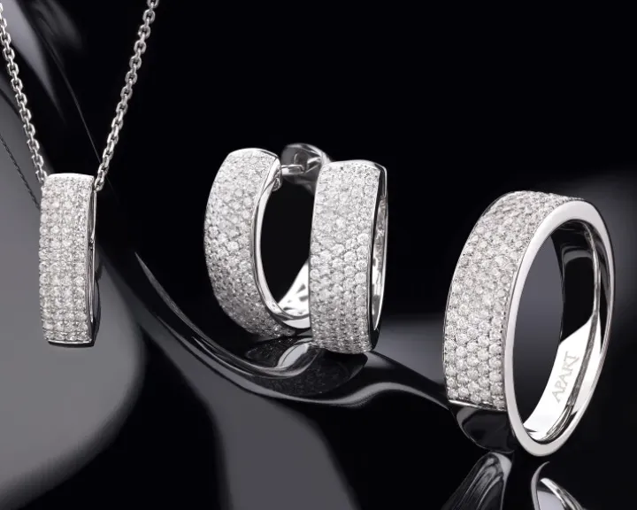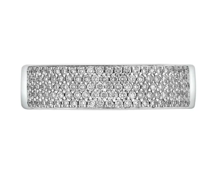 Minimalistyczny złoty pierścionek z diamentami. Obrączkowy pierścionek z białego złota przykuwa uwagę niezwykle intensywnym blaskiem regularnej kompozycji kunsztownie oprawionych diamentów, tworzących niemal jednolitą powierzchnię lśnienia. Idealny pierścionek z diamentami dla wielbicielki elegancji w nowoczesnym, wyróżniającym się szlachetną prostotą stylu.