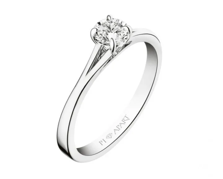 Brylantowy pierścionek z białego złota. Specjalna oprawa kamienia z wykorzystaniem pokrytego fasetkami detalu, umieszczonego poniżej brylantu sprawia, że jego blask jest spotęgowany. Intensywnie lśniący wzór to doskonały wybór jako pierścionek zaręczynowy z brylantem.