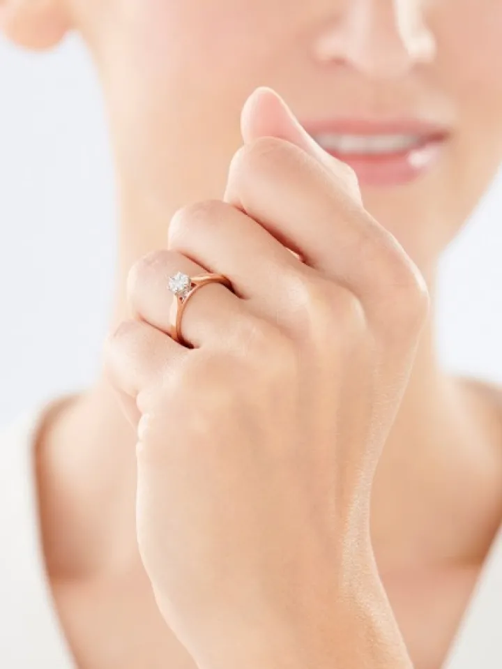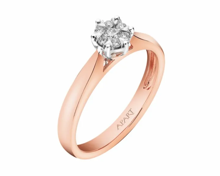 Chwila zaręczyn przypieczętowana diamentowym blaskiem. Lśniący brylantami pierścionek zaręczynowy z różowego i białego złota, zachwycający nieskazitelnymi refleksami, rozświetlającymi kunsztowną formę wzoru. Wyjątkowy pierścionek, który swoim wykwintnym stylem pięknie podkreśli moment zaręczyn i wyrazi siłę uczuć.