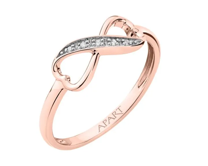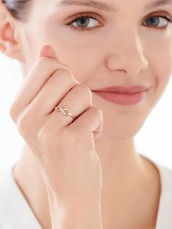 Diamentowy pierścionek z motywem nieskończoności i serca. Subtelny i romantyczny wzór z różowego złota zachwyca delikatnym kształtem z pięknym motywem dekoracyjnym w formie symbolu nieskończoności, harmonijnie przechodzącego w kształt serca. To wyjątkowy pierścionek z diamentami, który idealnie sprawdzi się w roli prezentu na wiele okazji; można go także podarować w komplecie z pasującymi wzorami z nieskończonością i diamentami.
