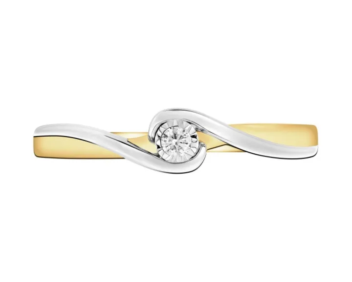 Chwila zaręczyn przypieczętowana diamentowym blaskiem. Pierścionek zaręczynowy w nowoczesnej odsłonie, z olśniewającym blaskiem brylantu. Wzór wykonano z żółtego złota, dopełnionego białym, które miękkimi liniami zdobi szynę pierścionka, zamykając się wokół szlachetnego kamienia. Lśnienie brylantu dodatkowo wzmacnia fasetowana otoczka z białego złota sprawiając, że wydaje się on optycznie większy. Pierścionek występuje także w zaręczynowej kolekcji w opcji z brylantem o większej karatowości.