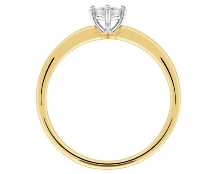 Dyskretnie elegancki złoty pierścionek z brylantem. Pierścionek z żółtego złota przykuwa uwagę lśniącym brylantem, który okala specjalna fasetowana otoczka z białego złota, dająca efekt optycznego powiększenia kamienia. Pierścionek z ponadczasowym blaskiem brylantu idealnie sprawdzi się jako pierścionek zaręczynowy.