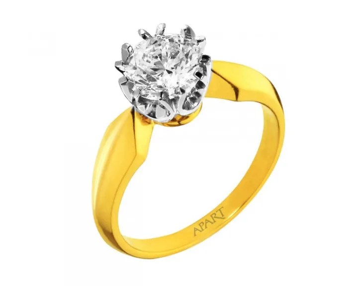 Chwila zaręczyn przypieczętowana diamentowym blaskiem. Widowiskowy, rozświetlający efekt ekskluzywny pierścionek zaręczynowy zawdzięcza imponującemu brylantowi o masie 1 karata, którego nieprzemijające piękno podkreśla i uwydatnia szatonowa oprawa. Wzór wykonano z klasycznego złota, z eleganckim białym akcentem.