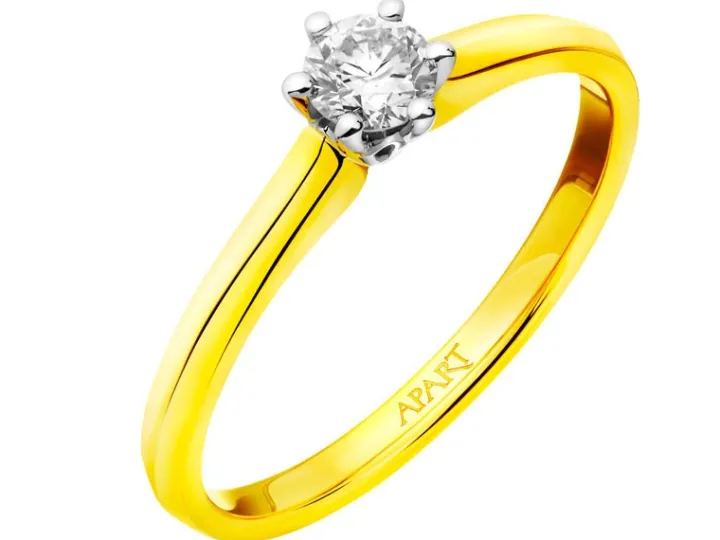 Klasyczny złoty pierścionek zaręczynowy z brylantem. Pierścionek z żółtego złota zachwyca okazałym brylantem w oprawie 6 krap z białego złota. Dzięki tej dyskretnej oprawie, kamień jest stabilnie przytrzymywany i jednocześnie może swobodnie lśnić na serdecznym palcu. Pierścionek zaręczynowy z brylantem to najchętniej wybierany wzór na tę wyjątkowo romantyczną okazję.