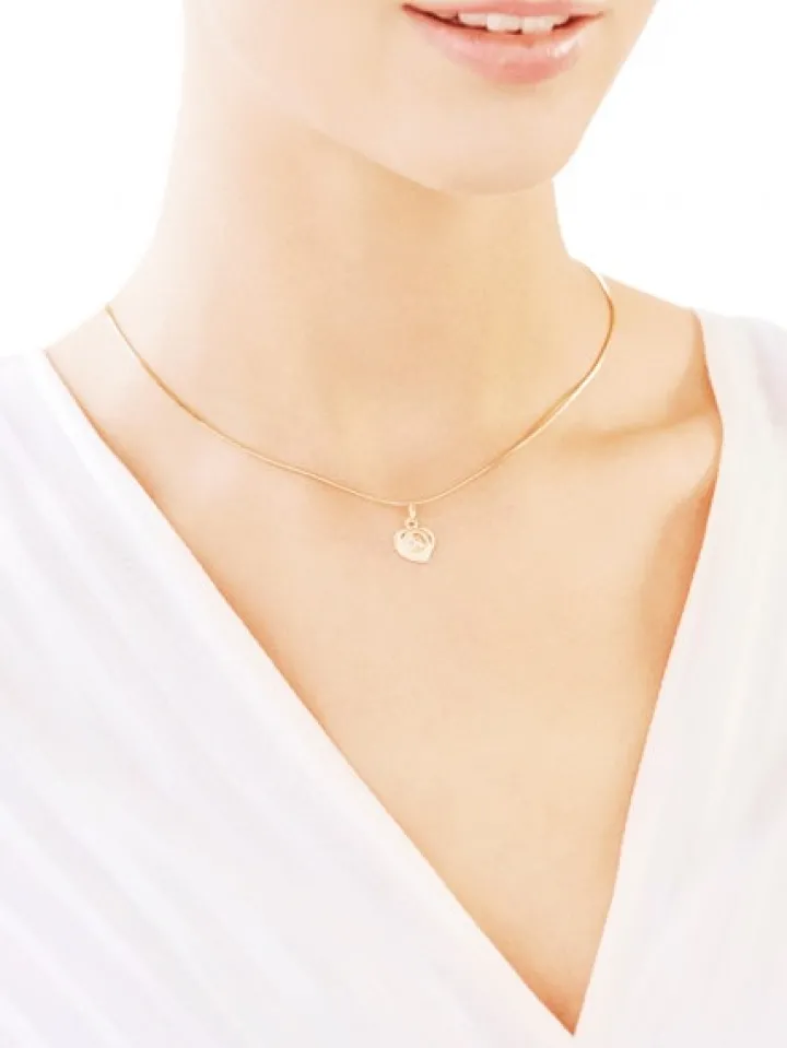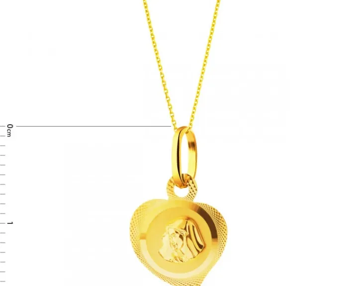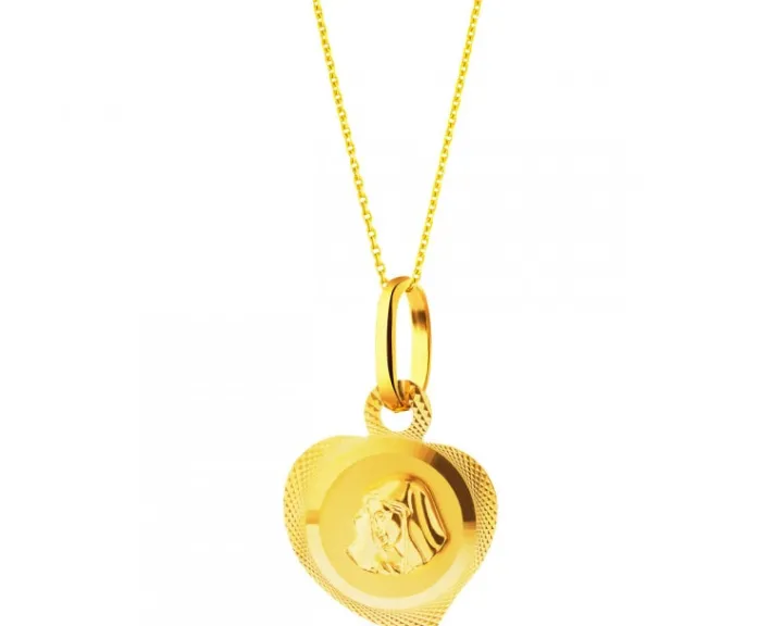 Złota zawieszka w kształcie serca, w której umieszczono wizerunek twarzy Maryi otulonej złotą chustą. Jej wyodrębnienie z ozdobnego tła za pomocą złotego nimbu stwarza wrażenie trójwymiarowości wizerunku, a zwrócenie twarzy postaci w prawo przenosi nas w sferę religijnych znaczeń symbolicznych związanych z prawą stroną, takich jak dobro, prawda i błogosławieństwo Boże. Doskonały prezent z okazji Pierwszej Komunii Świętej, urodzin czy Dnia Matki.