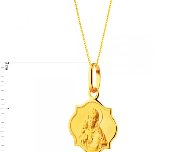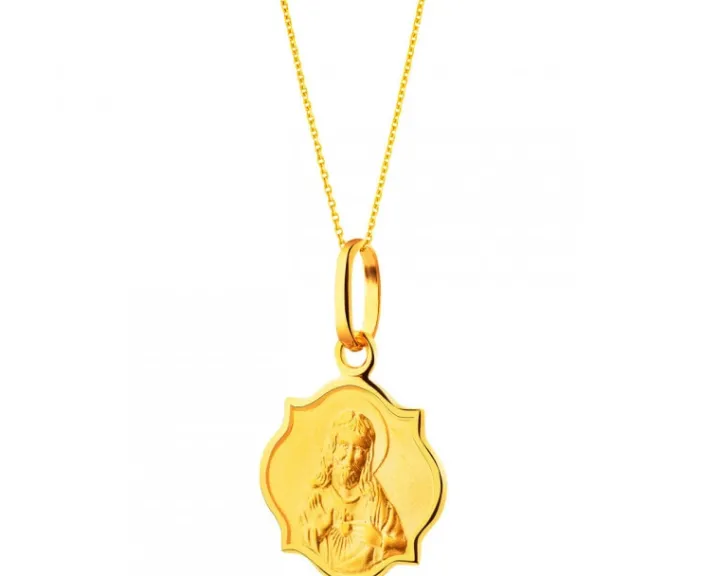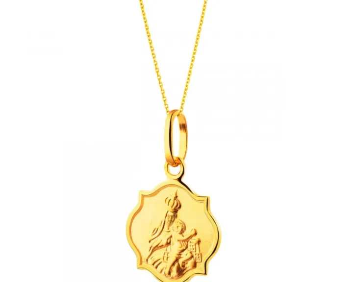 Perfekcyjnie wykonany, dwustronny złoty medalik szkaplerzny, przedstawiający na awersie wizerunek Chrystusa wskazującego na swoje serce, a na rewersie Matkę Bożą z Dzieciątkiem. Maryja i Jezus trzymają w dłoniach szkaplerz, czyli połączone ze sobą dwa małe prostokąty tkaniny z symbolami religijnymi. Medalik z postacią Matki Bożej Szkaplerznej może być właściwym podarunkiem w szczególnych sytuacjach życiowych.