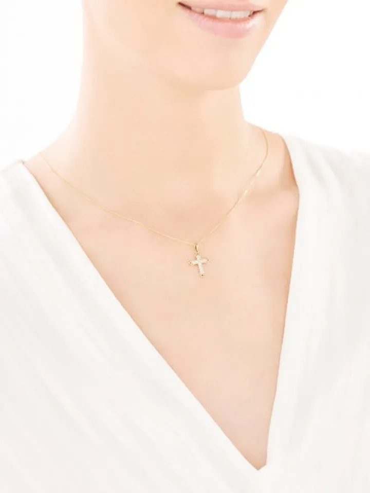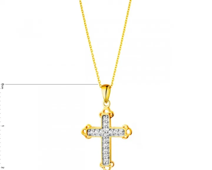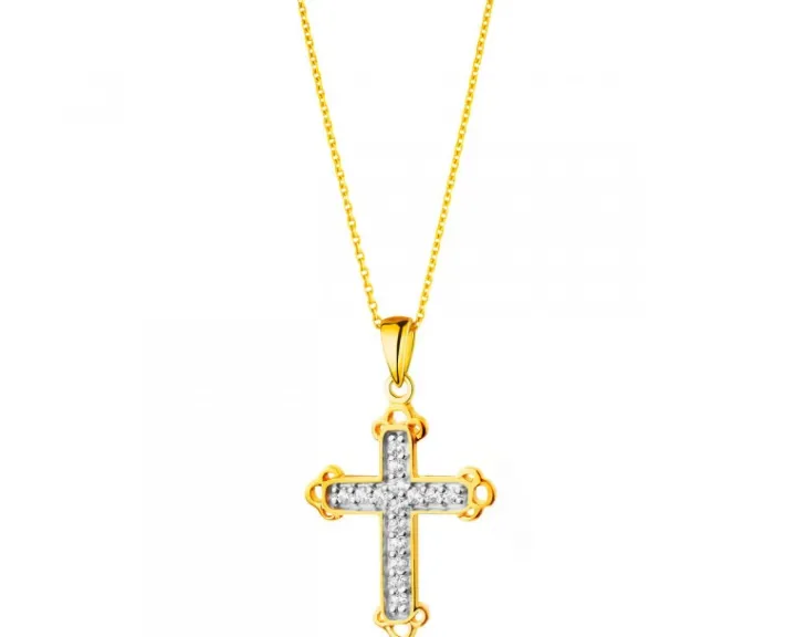 Oryginalny złoty krzyżyk bogato zdobiony lśniącymi cyrkoniami oraz ornamentami w zakończeniu jego ramion. Uwagę zwraca połączenie złota rodowanego we wnętrzu krzyża oraz żółtego złota – w obramowaniu jego kształtu, które zamyka całość w eleganckiej i klasycznej formie. Gustowny i przyciągający wzrok prezent z wielu różnych okazji.