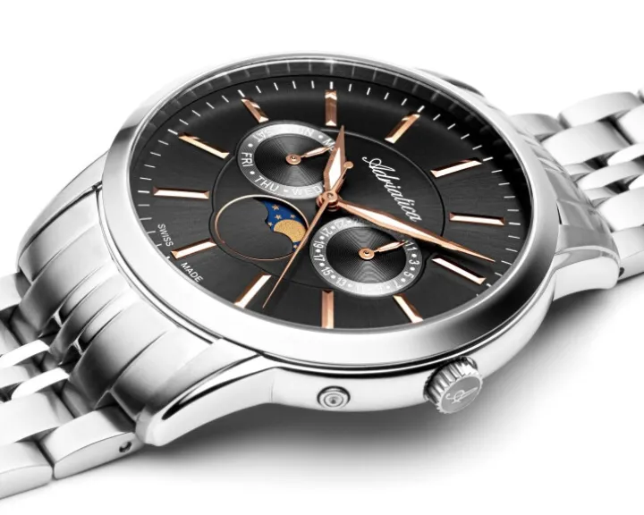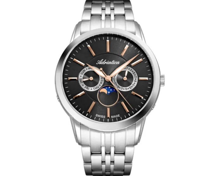 Cechy: datownik, wskazówkowy, sekundnik, wskaźnik dnia tygodnia, wskaźnik faz Księżyca