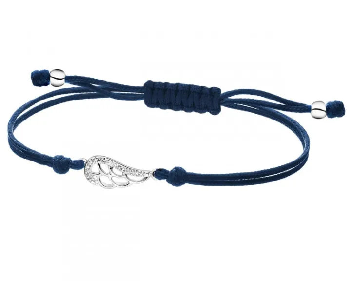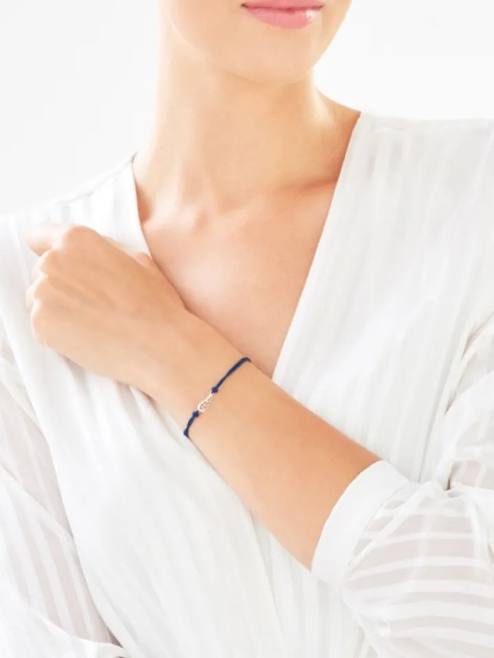 Kolekcjonuj radosne chwile! Delikatna bransoletka ze skrzydlatym elementem, wykonanym z białego złota rozświetlonego diamentami. Jej mniej formalny charakter podkreśla barwny sznurek w kolorze indygo, zwieńczony złotymi, kulistymi detalami. Bransoletka świetnie łączy się z innymi wzorami z kolekcji, tworząc lekkie, kolorowe zestawienia.