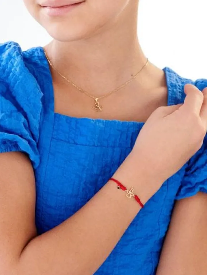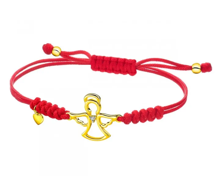 Kolekcjonuj radosne chwile! Złota bransoletka z figlarnymi złotymi detalami, wplecionymi w barwny sznurek. Bezpretensjonalny i lekki wzór zdobi połyskująca diamentem sylwetka anioła oraz maleńkie serce. Elementy z żółtego złota fantastycznie korespondują w bransoletce z soczystą czerwienią sznurka.