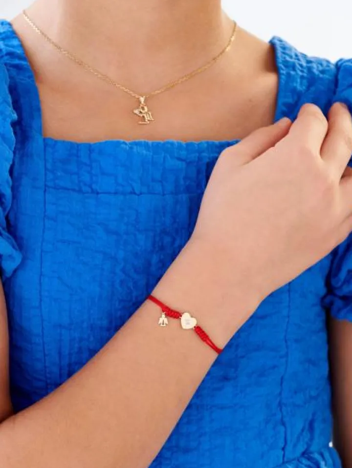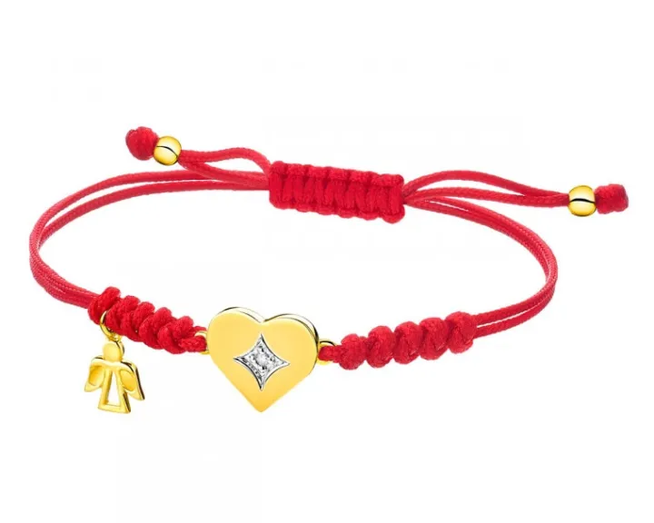 Kolekcjonuj radosne chwile! Lekka bransoletka z dekoracyjnymi detalami z żółtego złota i diamentem. Z delikatnym sznurkiem w kolorze energetycznej czerwieni skomponowano rozświetlone diamentowym blaskiem złote serce i filigranową sylwetkę anioła.
