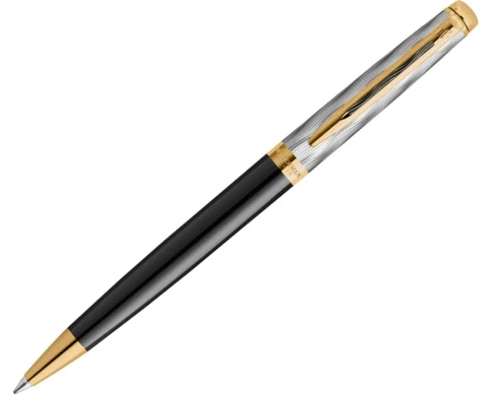 Waterman Hémisphère, długopis, metal i czarny lakier ze złotymi zdobieniami, cyzelowana nasadka, końcówka medium.