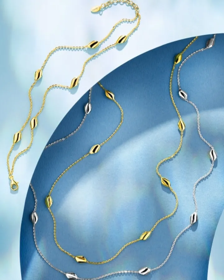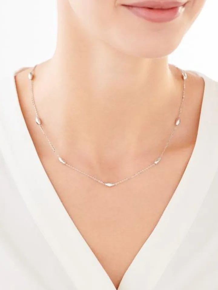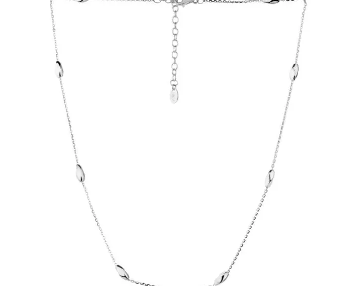 Modny i przykuwający uwagę srebrny naszyjnik z błyszczącymi fasolkami. Połączenie ozdobnych elementów o gładkich powierzchniach z delikatnym łańcuszkiem zaskakuje i zachwyca doskonale skomponowaną formą. Z wzorem współgra dopasowana bransoletka, ale można go łączyć z innymi naszyjnikami tworząc kreatywne zestawienia, które podkreślą stylizację i dodadzą każdej efektownego wykończenia. Naszyjnik w takim stylu to must have w osobistej kolekcji. W zależności od tego, do jakiego looku go założymy, może pełnić zarówno rolę dodatku eleganckiego, jak i casualowego. To biżuteria dla kobiet poszukujących minimalistycznych dodatków w intrygującej odsłonie.