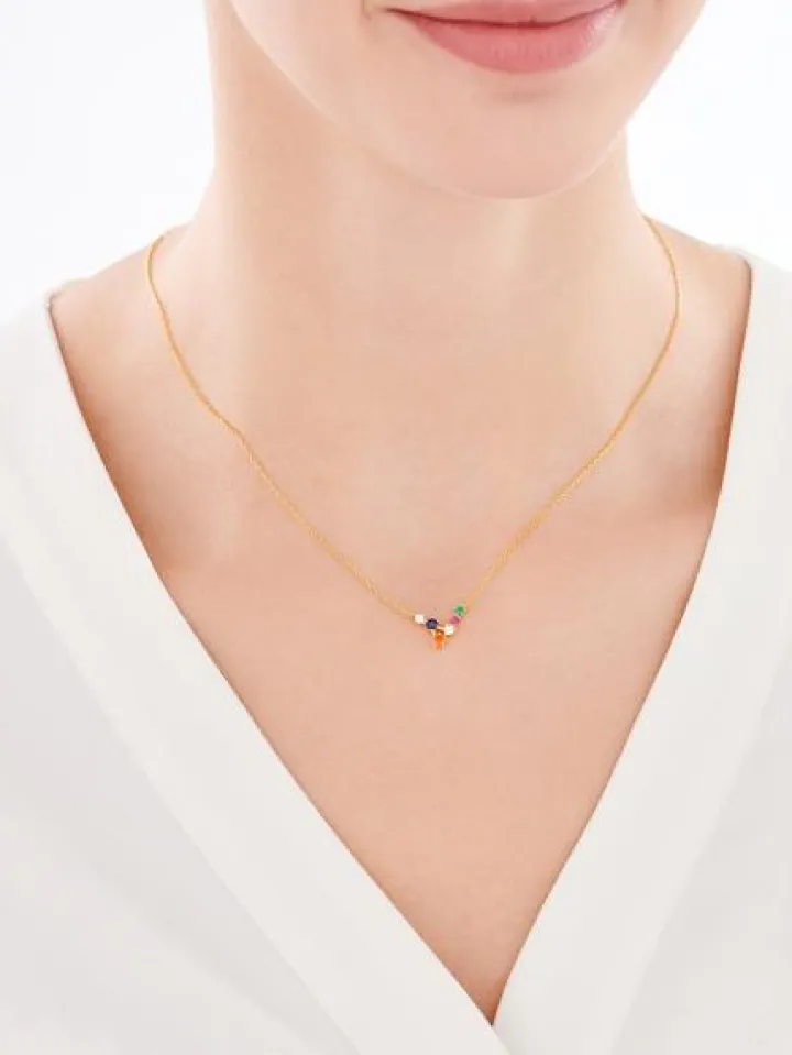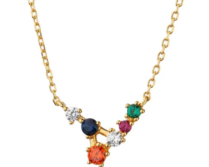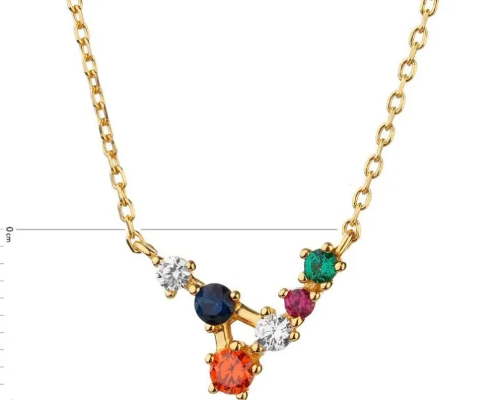 Wyjątkowo delikatny naszyjnik z pozłacanego srebra próby 925 i cyrkonii. Mimo subtelnej formy łańcuszka, po założeniu wzór przykuwa uwagę kompozycją białych i barwnych cyrkonii. Rozświetla dekolt i jest mocnym akcentem wielu stylizacji dzięki wielokolorowym refleksom. Naszyjnik można połączyć z wieloma wzorami, w tym z cyrkoniami w różnych odcieniach oraz z biżuterią w minimalistycznym stylu, tworząc ciekawe zestawienia. Wzór koresponduje zarówno z casualowym lookiem, jak i tym na specjalne okazje, dodając każdej z nich kolorytu.