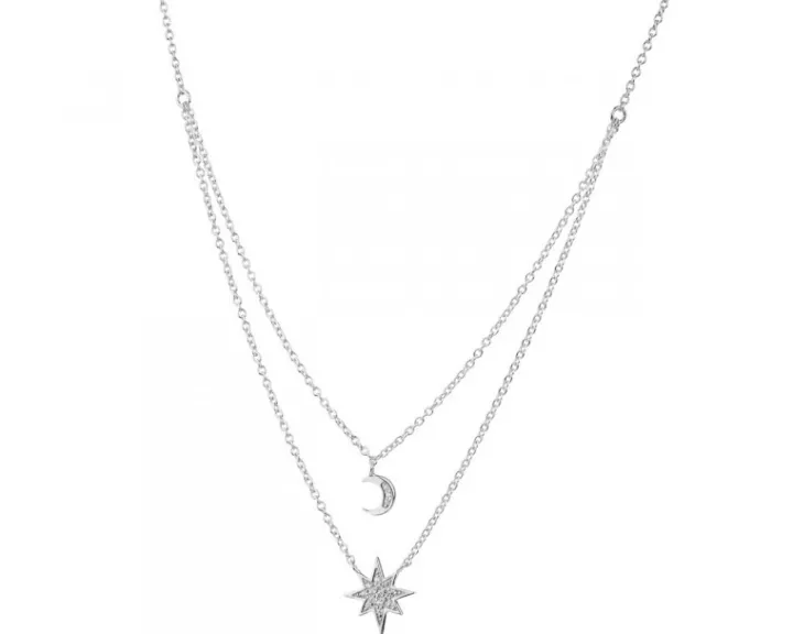 Pełen uroku srebrny naszyjnik z podwójną, kaskadową kompozycją łańcuszków ozdobionych zawieszkami w kształcie księżyca i gwiazdki. Rozświetlone blaskiem białych cyrkonii symbole nocnego nieba z delikatnością migoczą, pięknie rozświetlając dekolt. Naszyjnik spodoba się wielbicielkom subtelnych dodatków biżuteryjnych, które współgrają z wieloma stylizacjami.