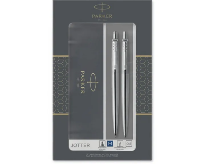 Symbol stylu od ponad 60 lat, długopisy i ołówki automatyczne Parker Jotter to codzienna ikona o nowoczesnym, opływowym designie. Parker Jotter w korpusie ze stali szlachetnej i chromowanych wykroczeniach łączy klasyczną estetykę i nowoczesny detal, podnosząc codzienne pisanie do rangi doświadczenia, którym należy się delektować. Dzięki efektownym szczegółom będzie doskonałym prezentem dla absolwentów, osób poszukujących pierwszej pracy i każdego, kto ceni sztukę przelewania myśli na papier. Opakowanie zawiera: 1 x długopis Jotter 1 x ołówek automatyczny Jotter z rysikiem w środku 1 x niebieski wkład QuinkFlow