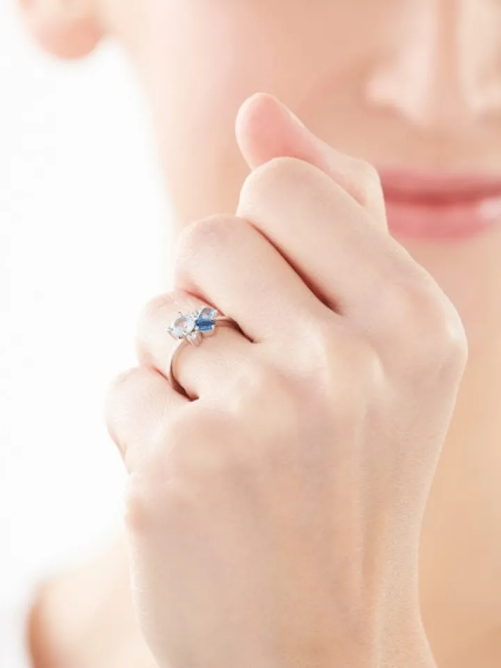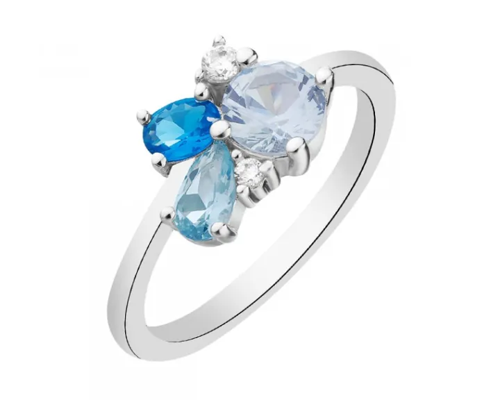 Piękny pierścionek ze srebra i barwnych cyrkonii. Kompozycja kunsztownie oszlifowanych cyrkonii o różnych kształtach przykuwa uwagę w pierścionku zachwycającą, błękitno – białą kolorystyką refleksów. Pierścionek wyjątkowo prezentuje się na kobiecej dłoni, a wraz z pasującymi do kompletu wzorami będzie ozdobą każdej stylizacji.
