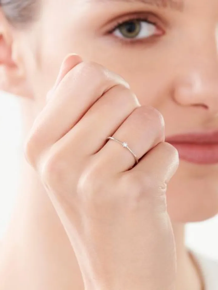Lśniący brylantem złoty pierścionek zaręczynowy. Wyjątkowo delikatny klasyczny wzór z białego złota lśni brylantem w oprawie sześciu krap, a efekt optycznego powiększenia kamienia uzyskano dzięki dyskretnej fasetowanej otoczce, która okala brylant. Wzór to idealny pierścionek zaręczynowy dla kobiety, która ceni w biżuterii brylantowy blask ujęty w subtelną, elegancką formę.