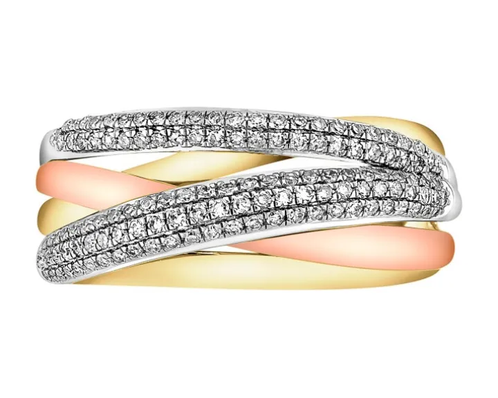 Wyrafinowany złoty pierścionek z diamentami. Ozdobiony przenikającymi się linearnymi elementami z żółtego, białego oraz różowego złota pierścionek dzięki precyzyjnie oprawionym kompozycjom diamentów prezentuje się na dłoni elegancko i wielowymiarowo. Pierścionek z diamentami spodoba się kobietom poszukującym wzorów w nowoczesnym, a jednocześnie wyszukanym stylu.