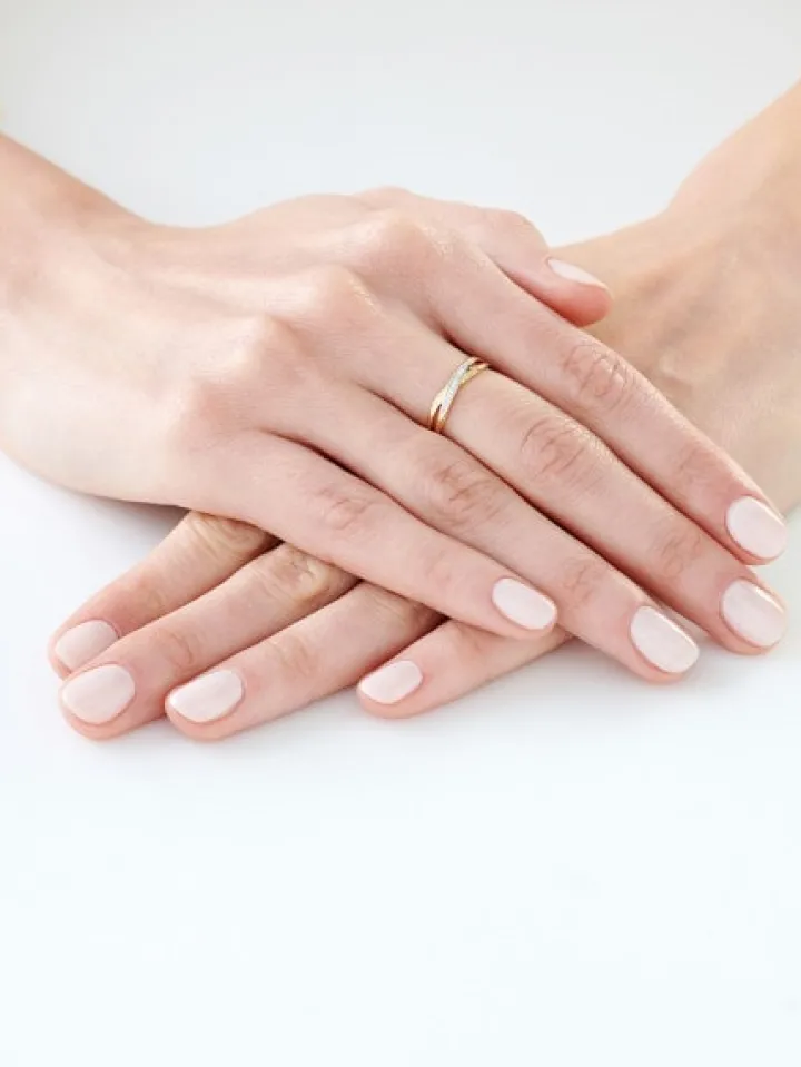 Nowoczesny złoty pierścionek z diamentami. Minimalistyczną formę pierścionka z żółtego złota przełamuje blask misternie oprawionych diamentów, które rozświetlają element dekoracyjny pierścionka w formie przenikających się elementów o łagodnych liniach. Idealny pierścionek dla wielbicielki dyskretnego stylu w biżuterii i lśnienia diamentów.