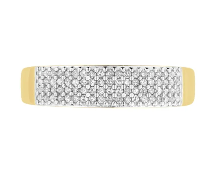 Obrączkowy złoty pierścionek z diamentami. Pierścionek z żółtego złota zachwyca nowoczesną formą, z którą współgra blask kunsztownie oprawionych diamentów tworzących regularną kompozycję. Tak precyzyjna oprawa kamieni sprawiła, że pierścionek wyróżnia się wyjątkowym, niemal jednolitym blaskiem. Wzór idealny dla kobiet, dla których pierścionek z diamentami powinien być nowoczesny, elegancki i szykowny.