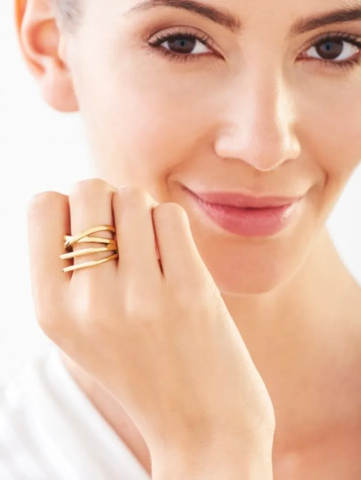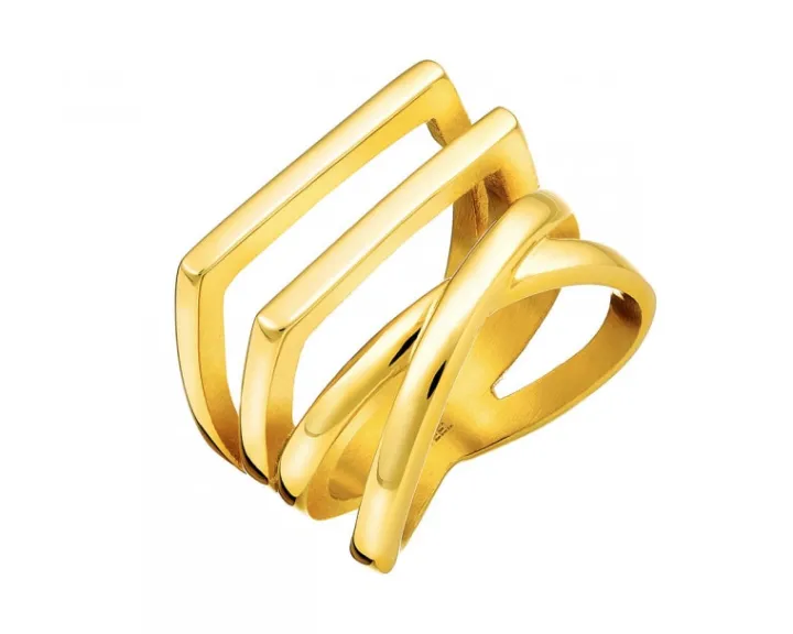 Pierścionek w nowoczesnym stylu, wykonany ze stali szlachetnej w kolorze złota. Dekoracyjny motyw w pierścionku tworzy graficzna kompozycja równoległych i krzyżujących się linii. Wzór występuje również w kolorze różowego złota oraz srebrnym, a także można do niego dopasować bransoletę z kolekcji.