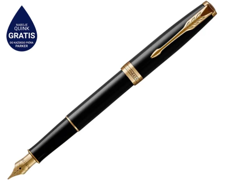 PARKER Sonnet pióro wieczne Black Lacquer GT, głęboki czarny lakier ze złotymi wykończeniami, stalówka fine, opakowanie prezentowe