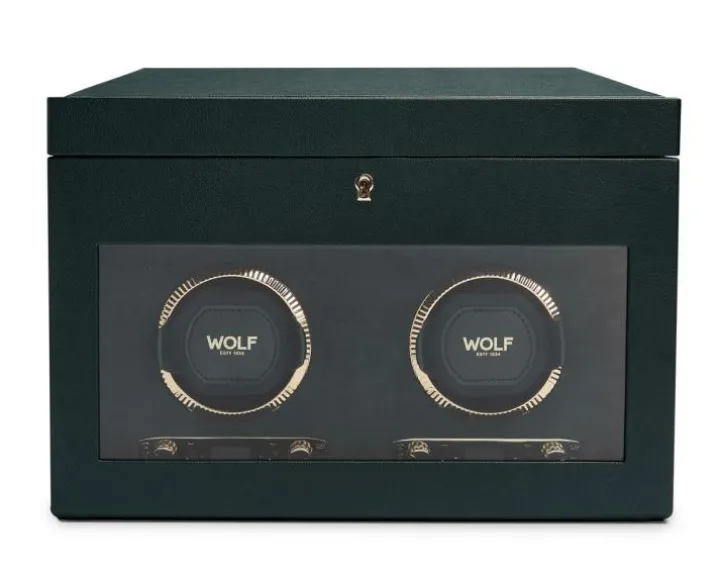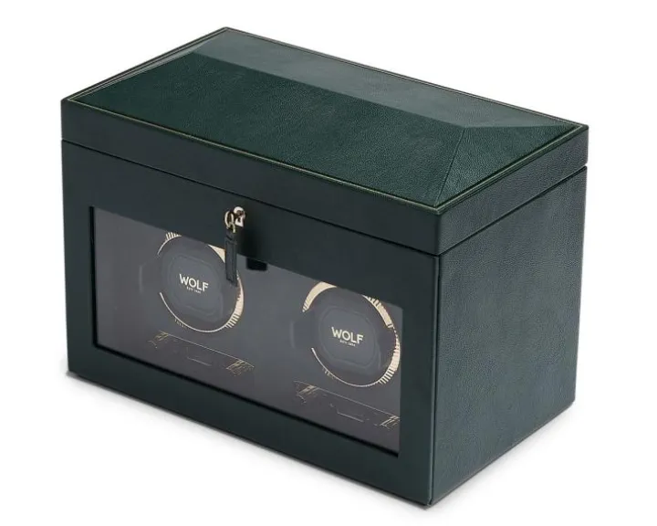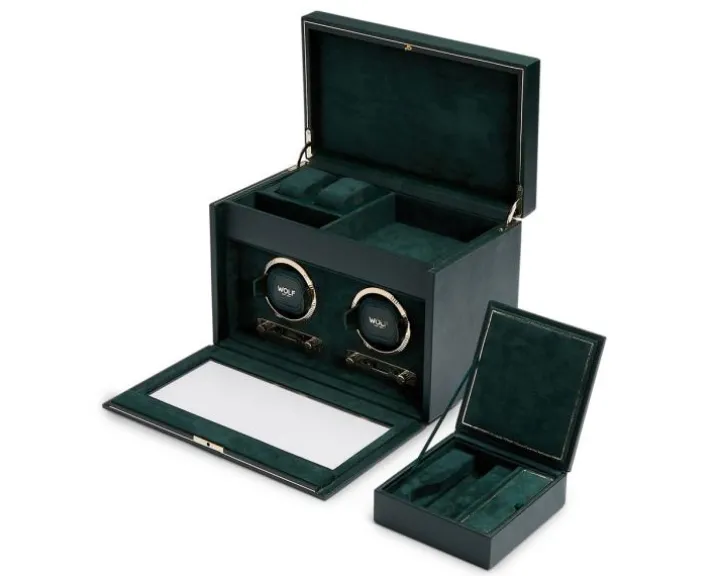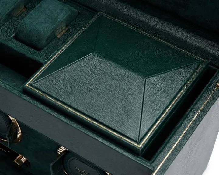 Rotomat o wymiarach 33,66 x 19,69 x 24.77 cm. Przeznaczony dla dwóch zegarków. Posiada dodatkowe miejsca na przechowywanie oraz etui podróżne. Wykonany ze skóry wegańskiej.