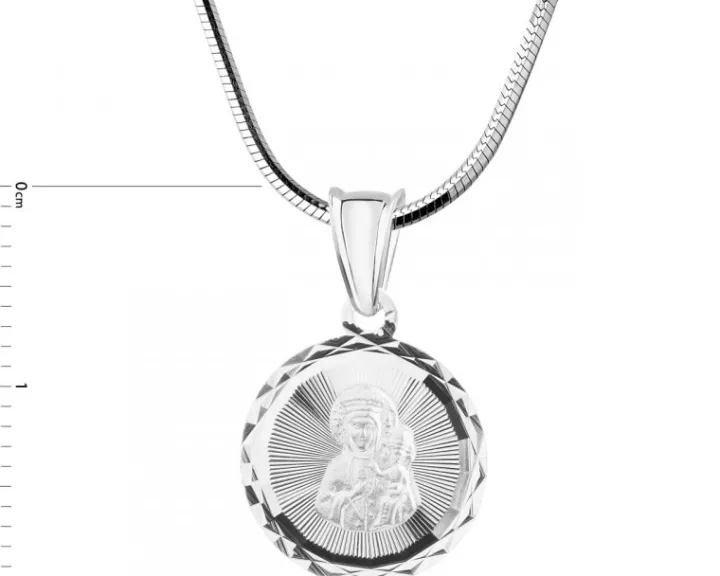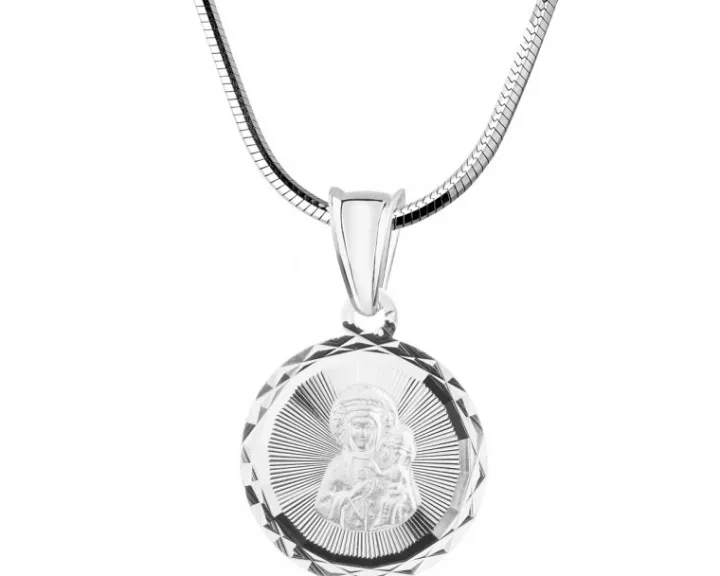 Wyrazisty owalny medalik z postacią ukoronowanej Matki Bożej Częstochowskiej z Dzieciątkiem, otoczoną efektownym zdobieniem wykonanym w rodowanym srebrze. Zawieszka olśniewa blaskiem i przykuwa wzrok. Doskonały prezent z okazji Pierwszej Komunii Świętej, urodzin czy Dnia Matki.