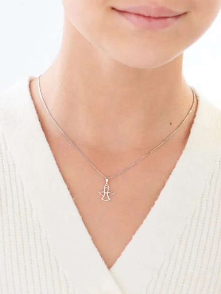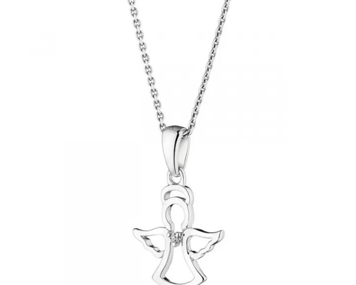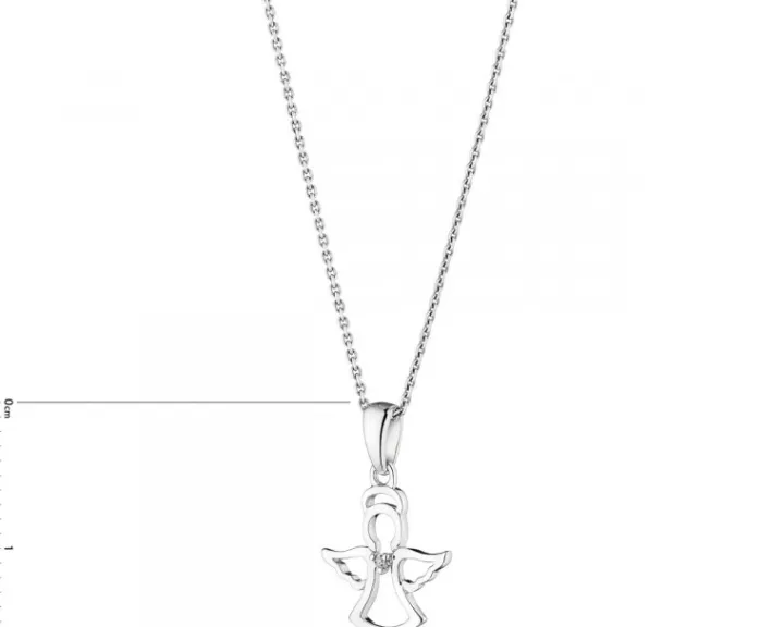 Filigranowa zawieszka z białego złota z rozświetlającym blaskiem diamentu. Kształt dziecięcej zawieszki nawiązuje do sylwetki anioła.