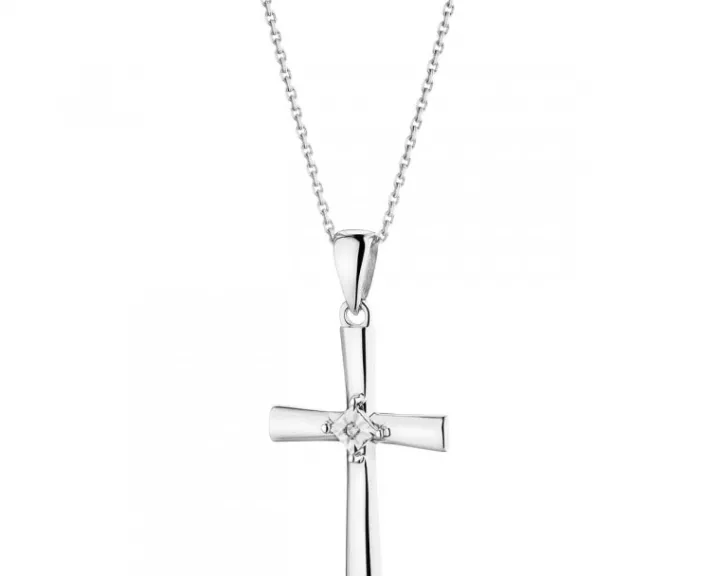 Krzyżyk z białego złota, którego klasyczną formę przełamano niebanalnym elementem dekoracyjnym w postaci diamentu, otoczonego rombem ujętym w cztery krapy. Dzięki temu zawieszka lśni wyjątkowym blaskiem, a diament wydaje się optycznie większy. Zawieszka z pewnością zachwyci każdą obdarowaną nią osobę.