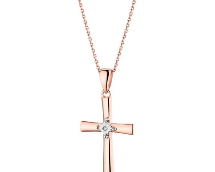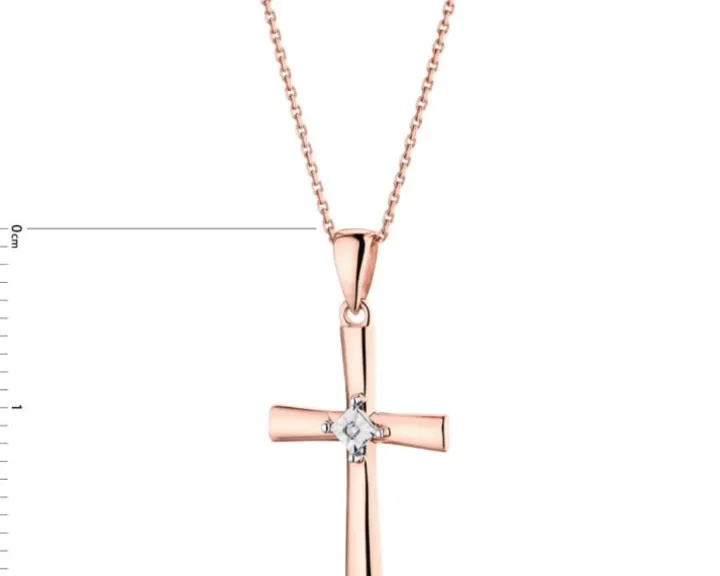Krzyżyk z różowego złota, którego klasyczną formę przełamano niebanalnym elementem dekoracyjnym w postaci diamentu, otoczonego rombem z białego złota ujętym w cztery krapy. Dzięki temu zawieszka lśni wyjątkowym blaskiem, a diament wydaje się optycznie większy. Zawieszka z pewnością zachwyci każdą obdarowaną nią osobę.
