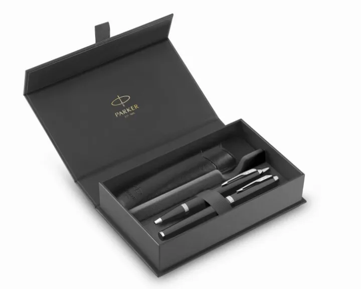 Klasyczny zestaw Parker IM w zestawie z etui ze skóry ekologicznej typu sleeve zapakowane w ekskluzywne pudełko uchylne zamykane magnetycznie. Czarny, ergonomiczny uchwyt, jak w historycznych modelach marki. Wyraźnie zaznaczone „lotki strzały” na klipsie. Smukły kształt. Skuwka i korpus pokryte błyszczącym lakierem w kolorze głębokiej czerni wzbogacone o potrójny pierścień, którego środkowy element posiada logo Parkera. Wykończenia chromowane. Stalówka wykonana z wysokiej jakości stali szlachetnej.