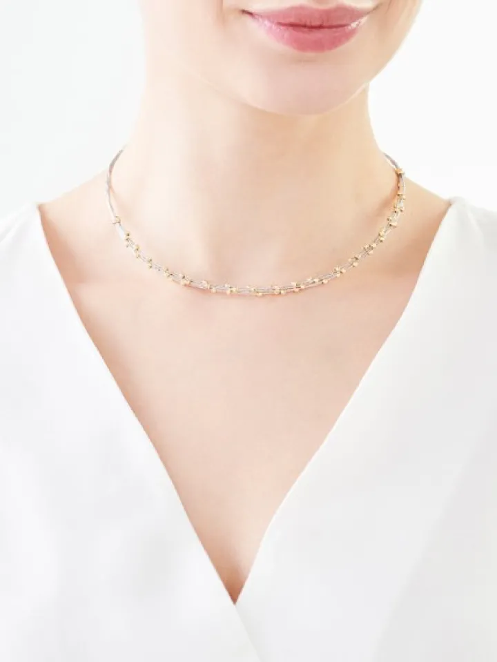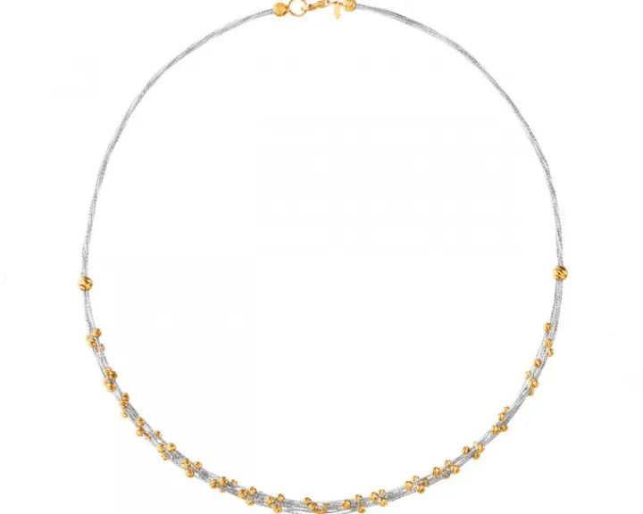 Elegancki, będący formą nowoczesnej kolii naszyjnik z białego oraz żółtego złota. O wyjątkowym stylu naszyjnika decyduje kombinacja chłodnych refleksów białego złota z kontrastującymi ciepłymi refleksami kulistymi elementami dekoracyjnymi. Naszyjnik koresponduje z dwiema bransoletkami, z dominującym białym lub żółtym złotem do wyboru.