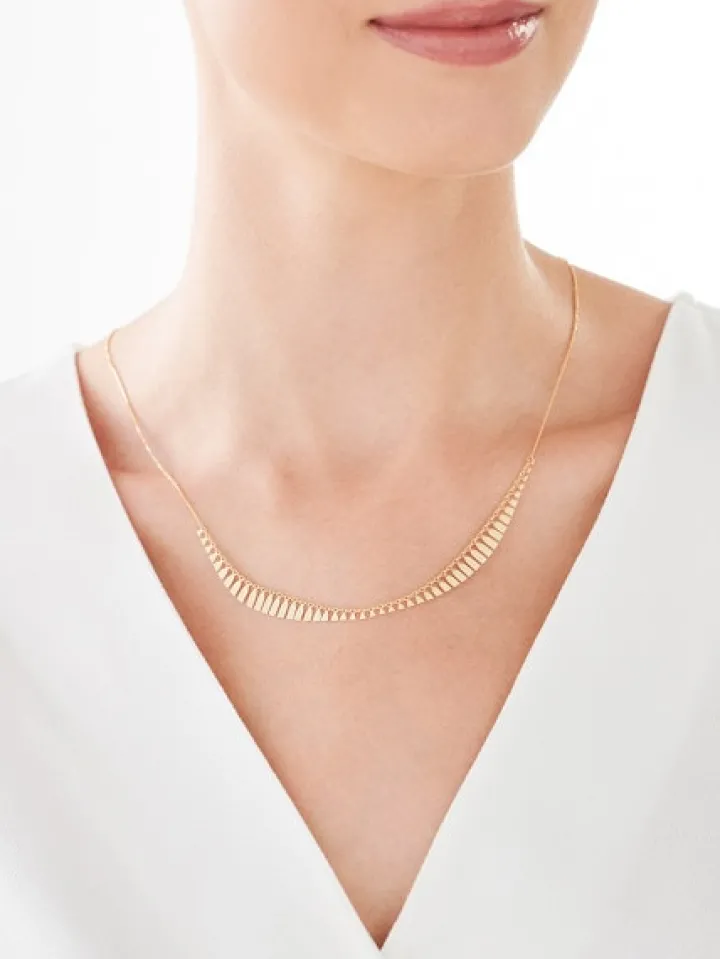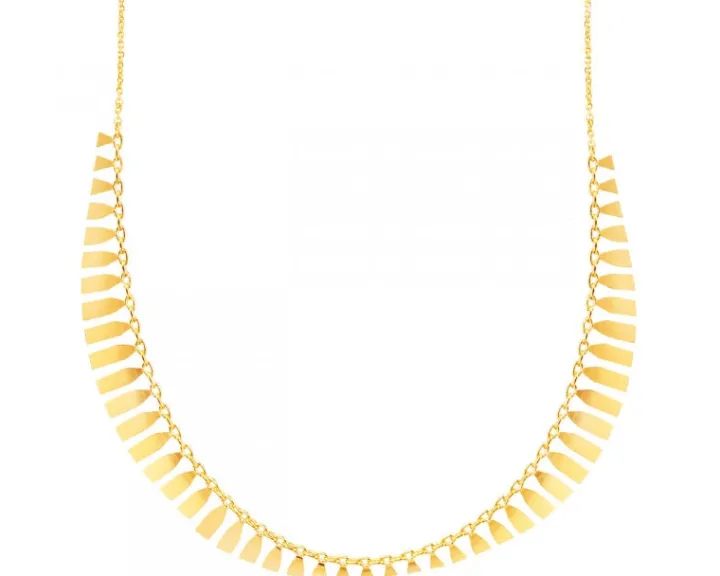 Intrygujący krótki naszyjnik z regularną kompozycją delikatnych elementów z żółtego złota. Wzór subtelnie nawiązuje do stylu etnicznych naszyjników, zachowując przy tym uniwersalny charakter, dzięki czemu będzie doskonałym dodatkiem biżuteryjnym do różnych stylizacji.