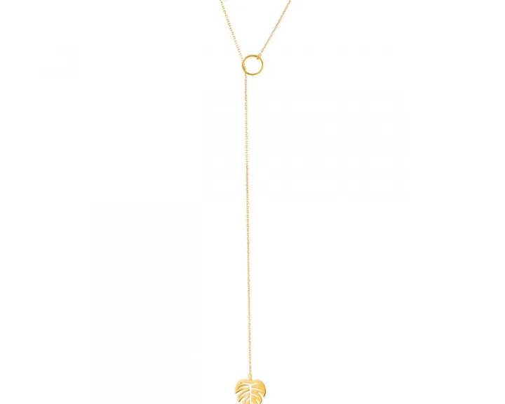 Ozdobiony niezwykle popularnym motywem liścia monstery naszyjnik z żółtego złota. Dekoracyjna zawieszka o charakterystycznym kształcie swobodnie opada na delikatnym łańcuszku, dzięki czemu forma naszyjnika prezentuje się subtelnie, a przy tym oryginalnie. Naszyjnik można uzupełnić wzorami z liściem monstery do kompletu, na przykład bransoletką i kolczykami.