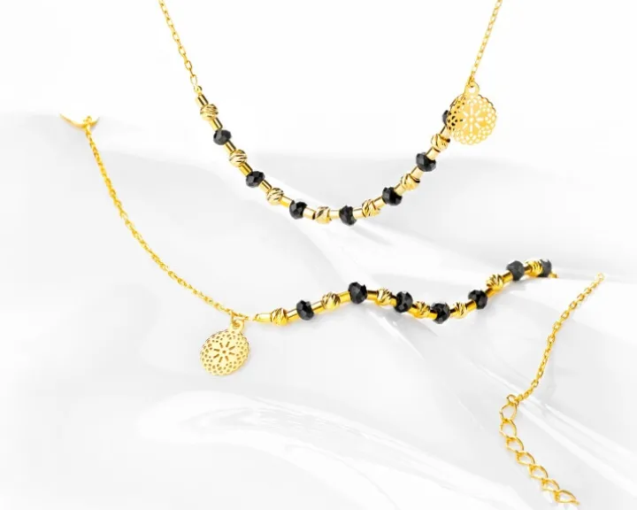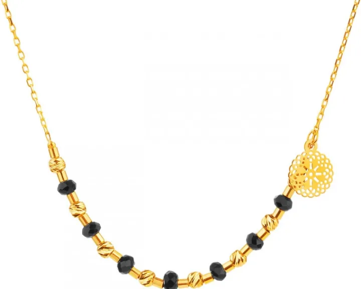 Wyjątkowy naszyjnik ze złota z zachwycającą kompozycją złotych elementów, czarnych cyrkonii i pięknej, kunsztownie wykonanej ażurowej zawieszki. Naszyjnik charakteryzuje się intensywnym kontrastem, a przy tym zachowuje oryginalny, eteryczny styl, podobnie jak pasująca do niego bransoletka. To biżuteria wyrafinowana, w nowoczesnym duchu, dedykowana współczesnym, przebojowym kobietom.
