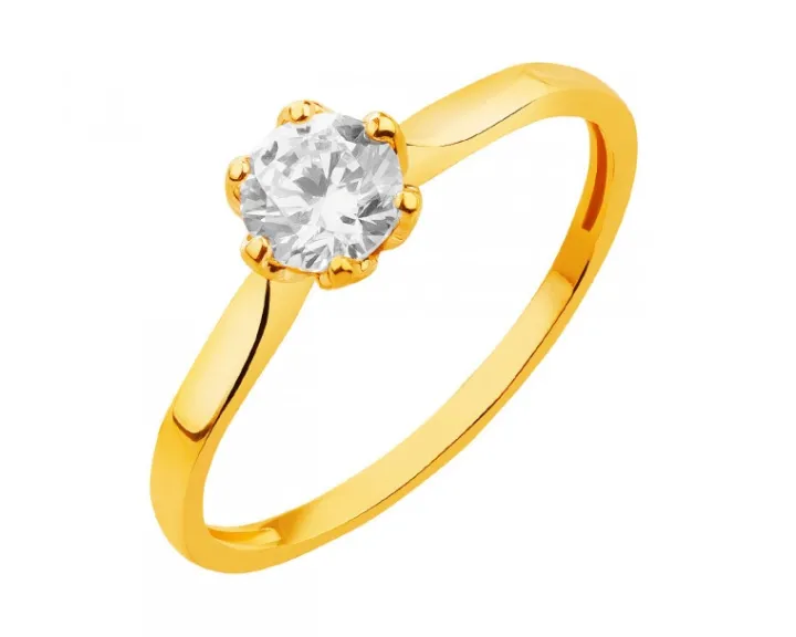 Urzekający pierścionek z żółtego złota z cyrkonią, delikatnie obejmowaną przez sześć złotych krap. Subtelny i pełen wdzięku, przypominający wiosenny kwiat, roztacza migoczący blask, który może opromienić radosny dzień zaręczyn.
