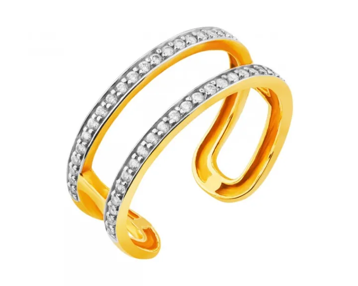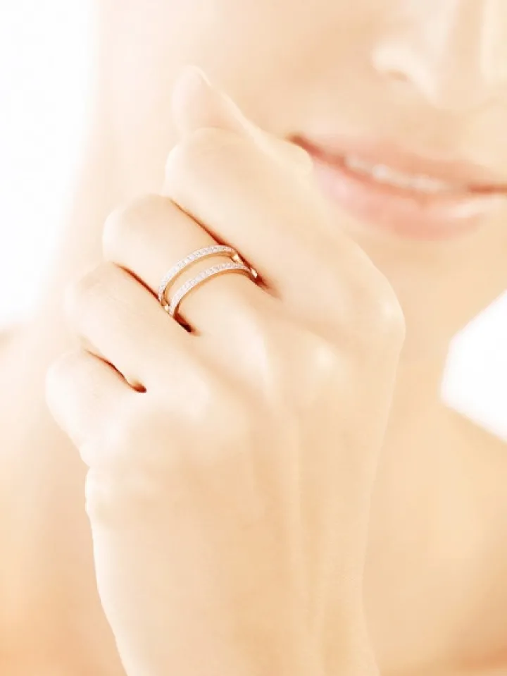 Spotkanie egzotyki z oryginalnością. Dwa rzędy rozświetlającego efektu linearnych kompozycji maleńkich cyrkonii, zdobią podwójny pierścionek z klasycznego złota. Harmonijny, uporządkowany koncept doskonale łączy się z podobnymi, segmentowymi propozycjami z kolekcji.
