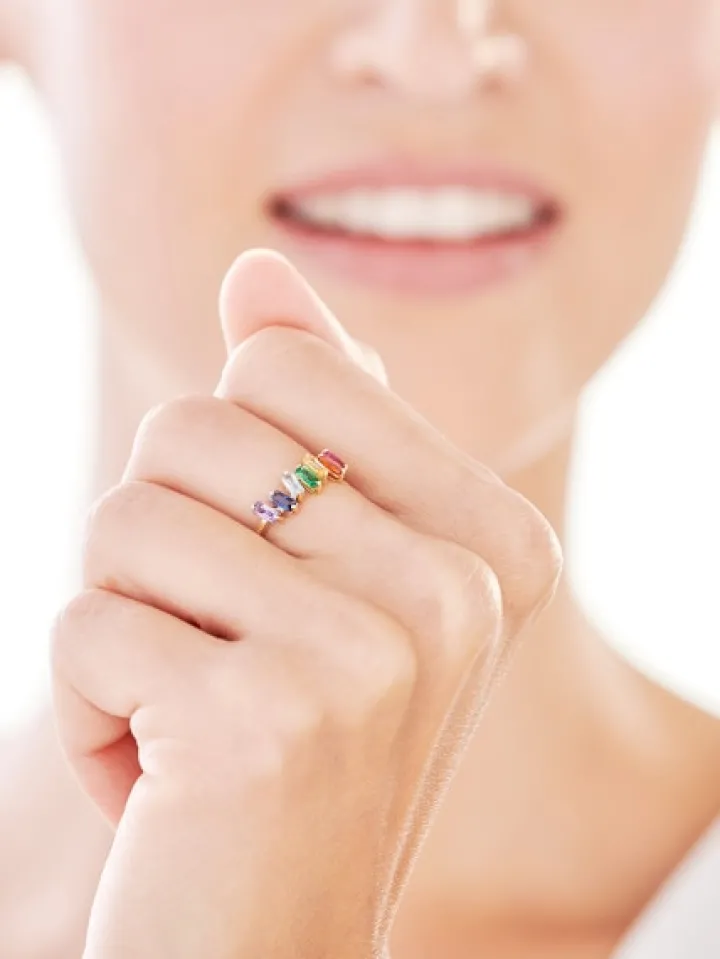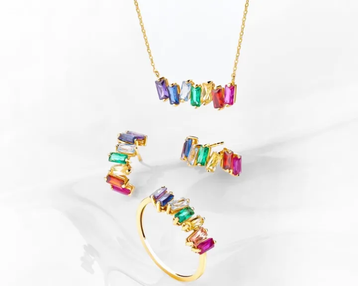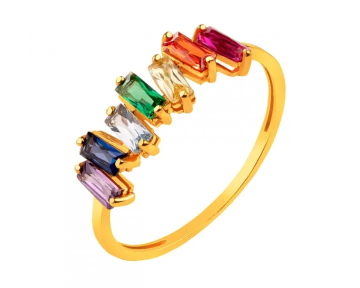Zniewalający piękną kompozycją barwnych cyrkonii pierścionek z żółtego złota. Zaskakujący stylem wzór ma delikatną formę, ale kolory oraz oprawa cyrkonii o szlifie bagieta sprawiają, że prezentuje się wyjątkowo efektownie. Wielobarwne cyrkonie ozdobiły pasujące do pierścionka kolczyki oraz olśniewający naszyjnik z kolekcji.