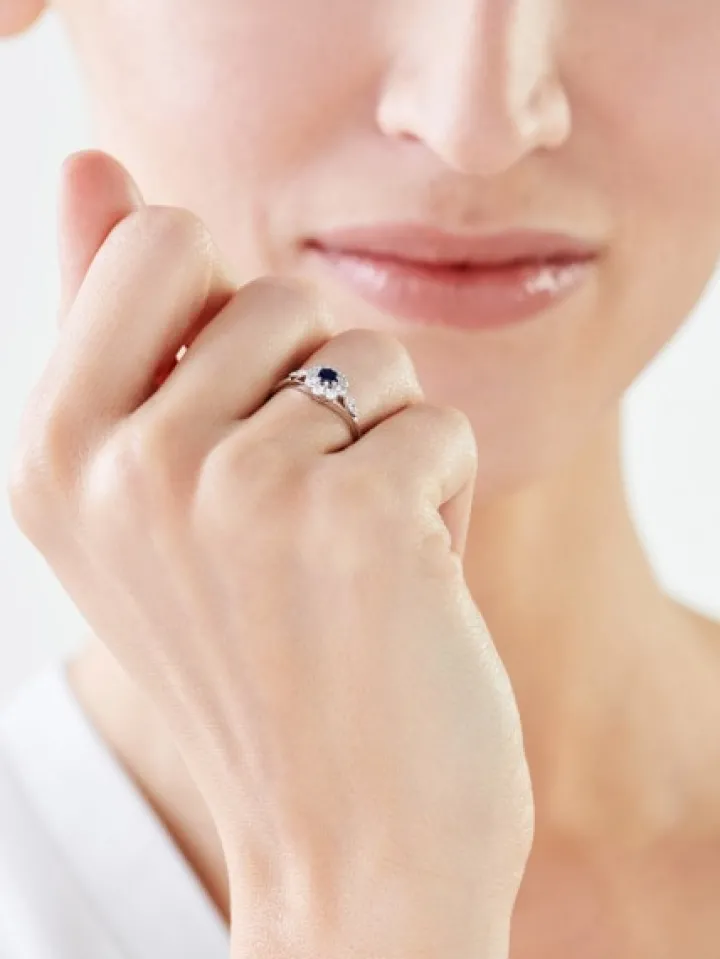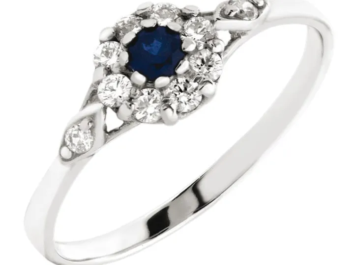 Okazały pierścionek z białego złota, bogato zdobiony dziesięcioma cyrkoniami, skrzy się refleksami ich migotliwego światła i blaskiem 14-karatowego złota. W sercu klejnotu umieszczono niezwykłej urody szafir, którego głębię eksponują otaczające go krapy z białego złota i lśniące cyrkonie. Wyrazisty charakter i dopracowana w najdrobniejszych szczegółach forma pierścionka wywierają niezapomniane wrażenie.